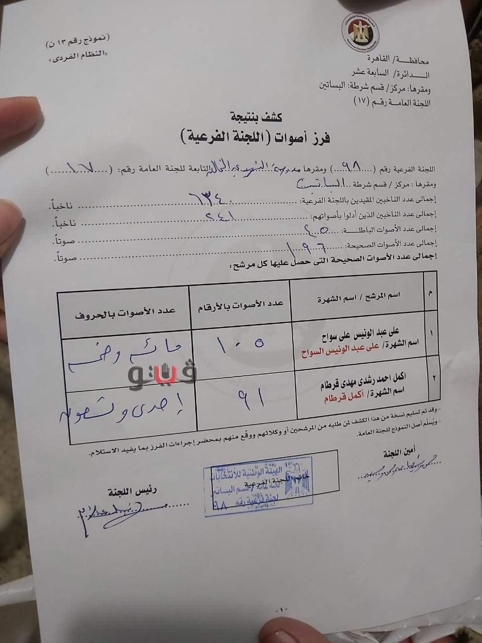 أظهر الحصر العددي لموشرات الفرز في اللجنة الفرعية رقم ٩٨ بمدرسة الشهيد عبد الخالق التابعة للجنة العامة رقم ١٧ ومقرها البساتين، حصول المرشح علي عبد الوانيس علي ١٠٥ صوت بينما حصل اكمل قرطام المرشح علي نفس الدائرة علي ٩١ صوت.