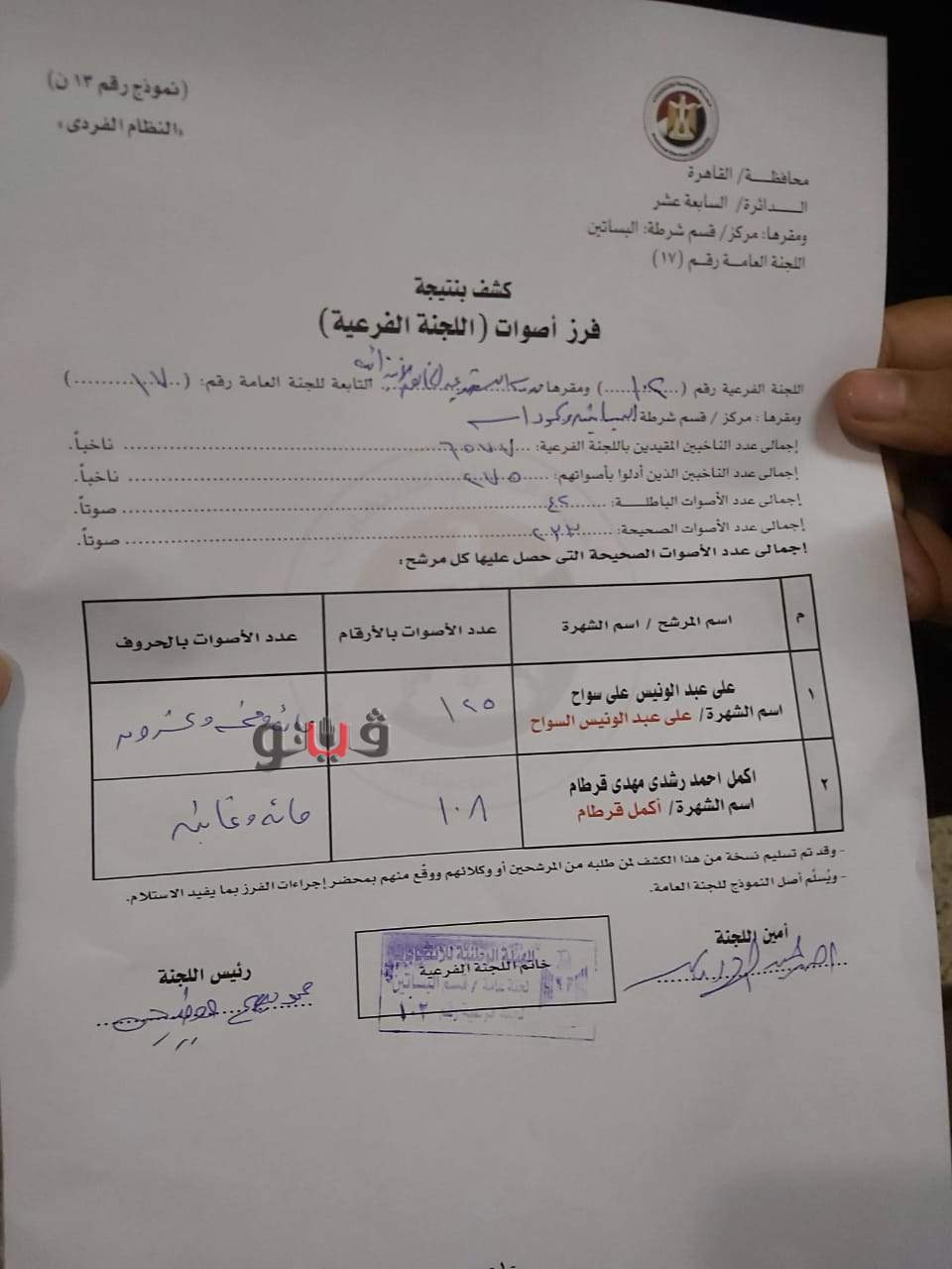 أظهرت مؤشرات الفرز في جولة الإعادة اللجنة الفرعية رقم ١٠٢ ومقرها البساتين ودار السلام بمدرسة الشهيد عبد الخالق الابتدائية عن حصول المرشح أكمل قرطام عن ١٠٨ أصوات، بينما حصل منافسه على ١٢٥ صوتا.