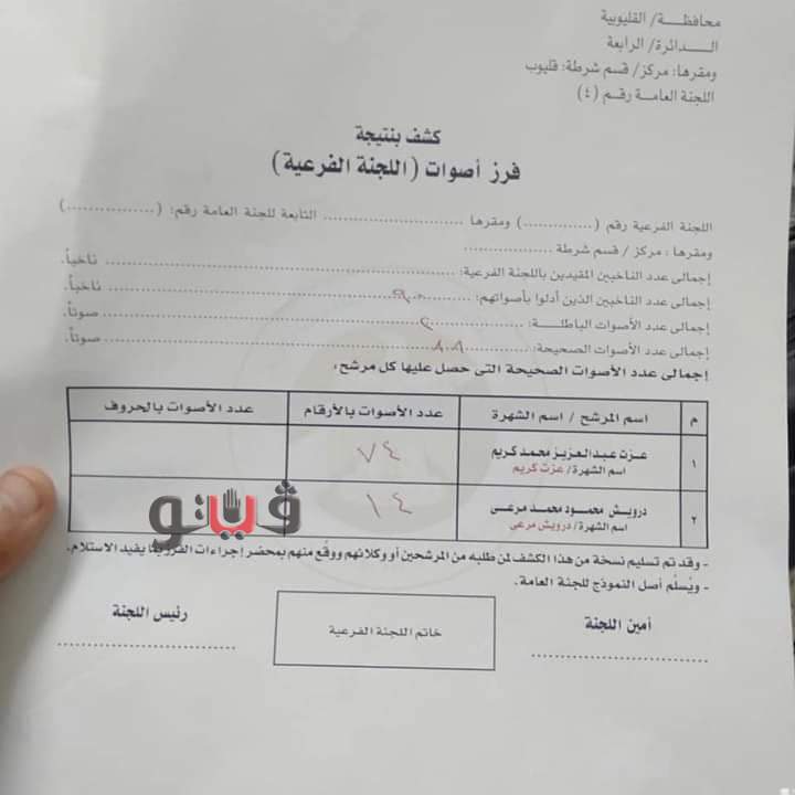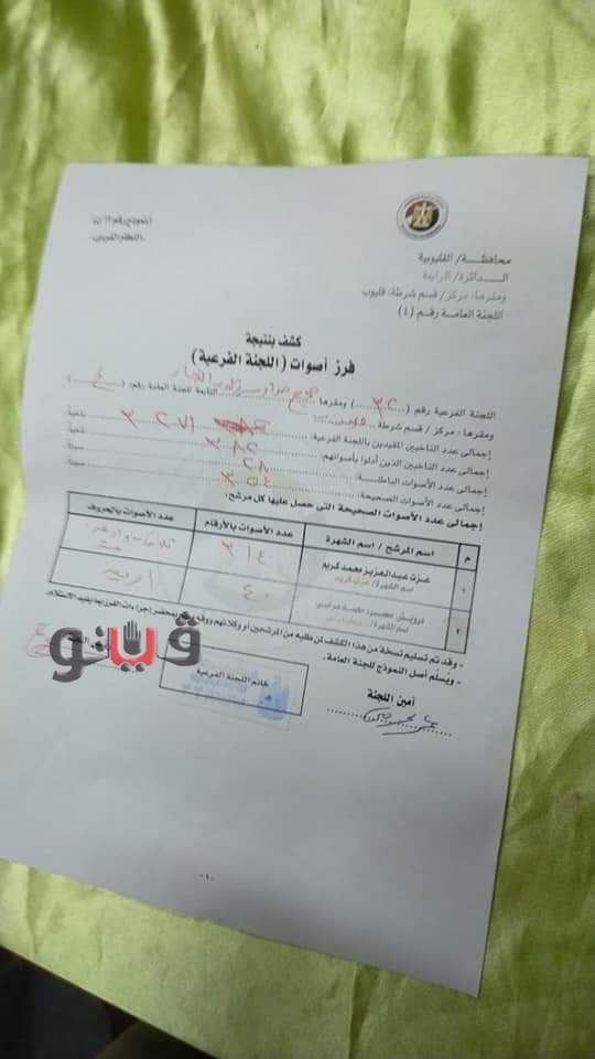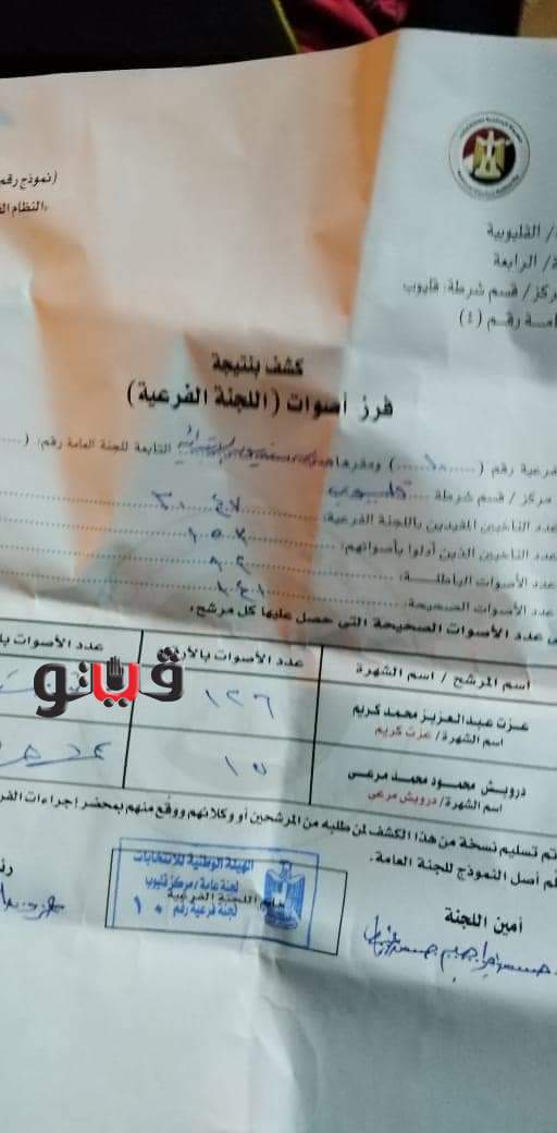 اظهر الحصرالعددي ل٥ لجان انتخابية بدائرة قليوب والقناطر الخيرية والتي اجريت جولة الاعادة علس المقعد الثالث لمجلس النواب بها اليوم وامس تقدم المرشح الاول وهو المهندس عزت كريم والذي يدخل السباق مستقل حيث حصل علي ٨٥١ صوت وبعده مرشح حزب مستقبل وطن درويش مرعي حيث حصل علي ١١٥ ضوت.