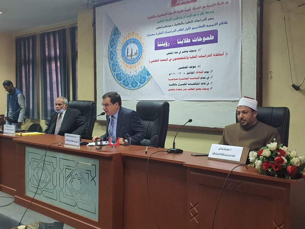 تحت ظلال التكوين الفكري المعتدل للأزهر الشريف عقدت كلية الدعوة الإسلامية جامعة الأزهر بالقاهرة أمس الثلاثاء، الملتقى العلمي الأول للتوجيه الأكاديمي لطلاب الدراسات العليا تحت عنوان "طموحات طلابنا.. رؤيتنا" والتي تهدف لوضع لبنة من لبنات تطوير الدراسات العليا والبحث العلمي لطلاب كلية الدعوة الإسلامية.