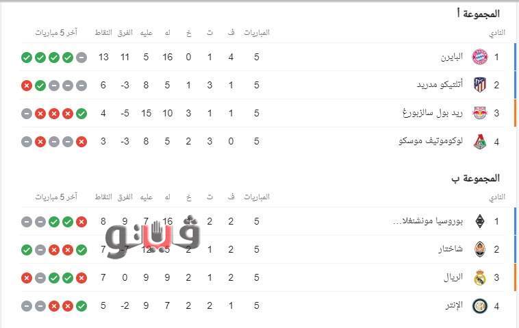 مونشنجلادباخ يتصدر الترتيب بـ8 نقاط وسيلتقي مع ريال مدريد الثالث بـ7 نقاط، بينما يواجه الإنتر صاحب المركز الأخير بـ5 نقاط نظيره شاختار صاحب المركز الثاني بـ7 نقاط والمتفوق على الريال بفارق الأهداف.