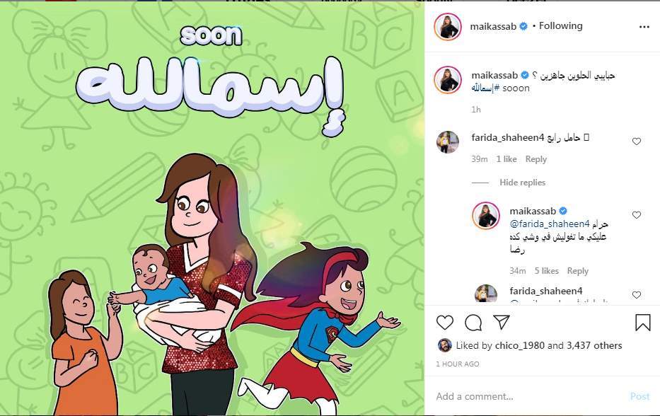 وكتبت مي كساب على إنستجرام "حبايبي الحلوين جاهزين؟ #إسمالله soon"، تعليقًا على صورة لسيدة تحمل طفلًا صغيرًا وحولها يلعب طفلتين.