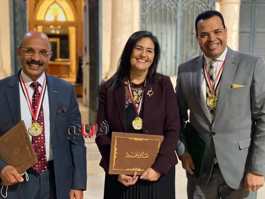 وضمت قائمة المكرمين بالذهبية الدكتورة هويدا مصطفى عميدة كلية الإعلام والدكتور عبد الراضي عبد المحسن عميد كلية دار العلوم.