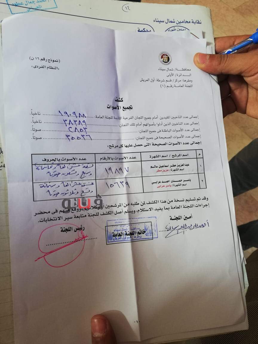 الحصر العددي للدائرة الأولى بشمال سيناء: عزيز مطر ١٩٨٩٧ وياسر عرابي ١٥٦٣٩