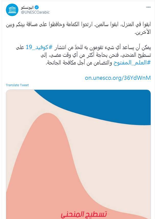 وكتبت "يونسكو" تغريدة على تويتر قالت فيها "ابقوا في المنزل، ابقوا سالمين. ارتدوا الكمامة وحافظوا على مسافة بينكم وبين الآخرين. يمكن أن يساعد أي شيء تقومون به للحدّ من انتشار #كوفيد_19 على تسطيح المنحنى، فنحن بحاجة أكثر من أي وقت مضى، إلى #العلم_المفتوح والتضامن من أجل مكافحة الجائحة"