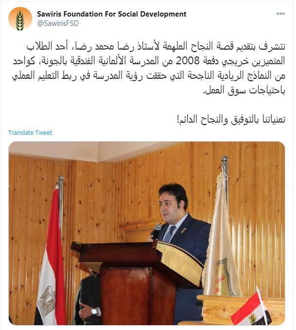 وكتبت مؤسسة ساويرس للتنمية الاجتماعية "نتشرف بتقديم قصة النجاح الملهمة لأستاذ رضا محمد رضا، أحد الطلاب المتميزين خريجي دفعة 2008 من المدرسة الألمانية الفندقية بالجونة، كواحد من النماذج الريادية الناجحة التي حققت رؤية المدرسة في ربط التعليم العملي باحتياجات سوق العمل. تمنياتنا بالتوفيق والنجاح الدائم!"