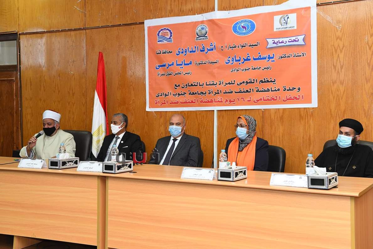 شهد اللواء اشرف الداودي محافظ قنا والدكتور يوسف غرباوي رئيس جامعة جنوب الوادي ختام فعاليات حملة "16 يوم لمناهضة العنف ضد المرأة " التي نظمها فرع المجلس القومي للمرأة بقنا في قاعة المؤتمرات بجامعة جنوب الوادي.