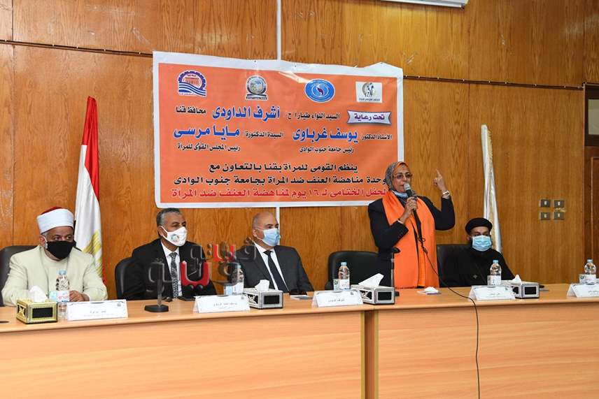 جاء ذلك بالتعاون مع وحدة مناهضة العنف ضد المرأة بجامعة جنوب الوادي جاء ذلك بحضور الدكتورة هدى سعدى مقررة فرع المجلس القومي للمرأة بقنا والمهندسة ايمان محمد المقرر المناوب لمجلس القومي للمرأة والشيخ احمد ابو الوفا مدير عام الدعوة بمديرية الأوقاف والقمص رافائيل وكيل مطرانية قنا .