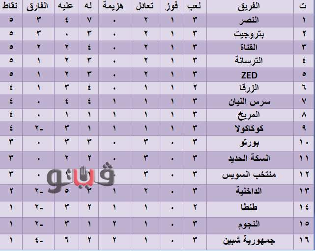 وتتساوى 5 أندية بنفس الرصيد 5 نقاط في مقدمة جدول ترتيب المجموعة وهم فرق النصر وبتروجت والقناة والترسانة وزد.