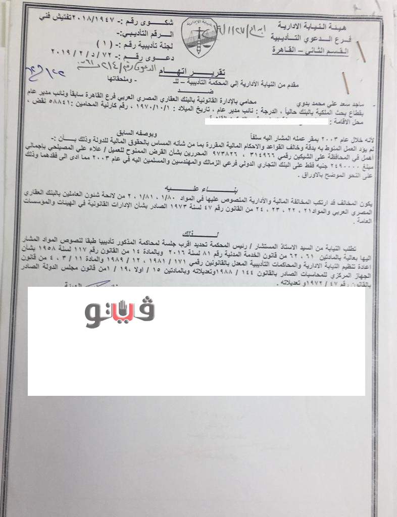 وانتهت التحقيقات إلى أنه ارتكب المخالفة المالية المنصوص عليها في المواد 80/1 ــ 81/1 ــ 2 من لائحة شئون العاملين بالبنك، والمواد أرقام 21 ــ 22 ــ 23 ــ 24، من القانون رقم 47 لسنة 1973 الصادر بشأن الإدارات القانونية في الهيئات والمؤسسات العامة.