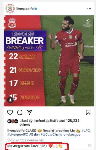 وقال جيرارد، الذي دافع عن ألوان نادي ليفربول بين العامين 1998 و2015، على منشور لحساب ليفربول في "إنستجرام" يظهر فيه اسم صلاح في صدارة هدافي الفريق في مسابقة دوري الأبطال، قائلا: "أحب ذلك مو (محمد صلاح)".