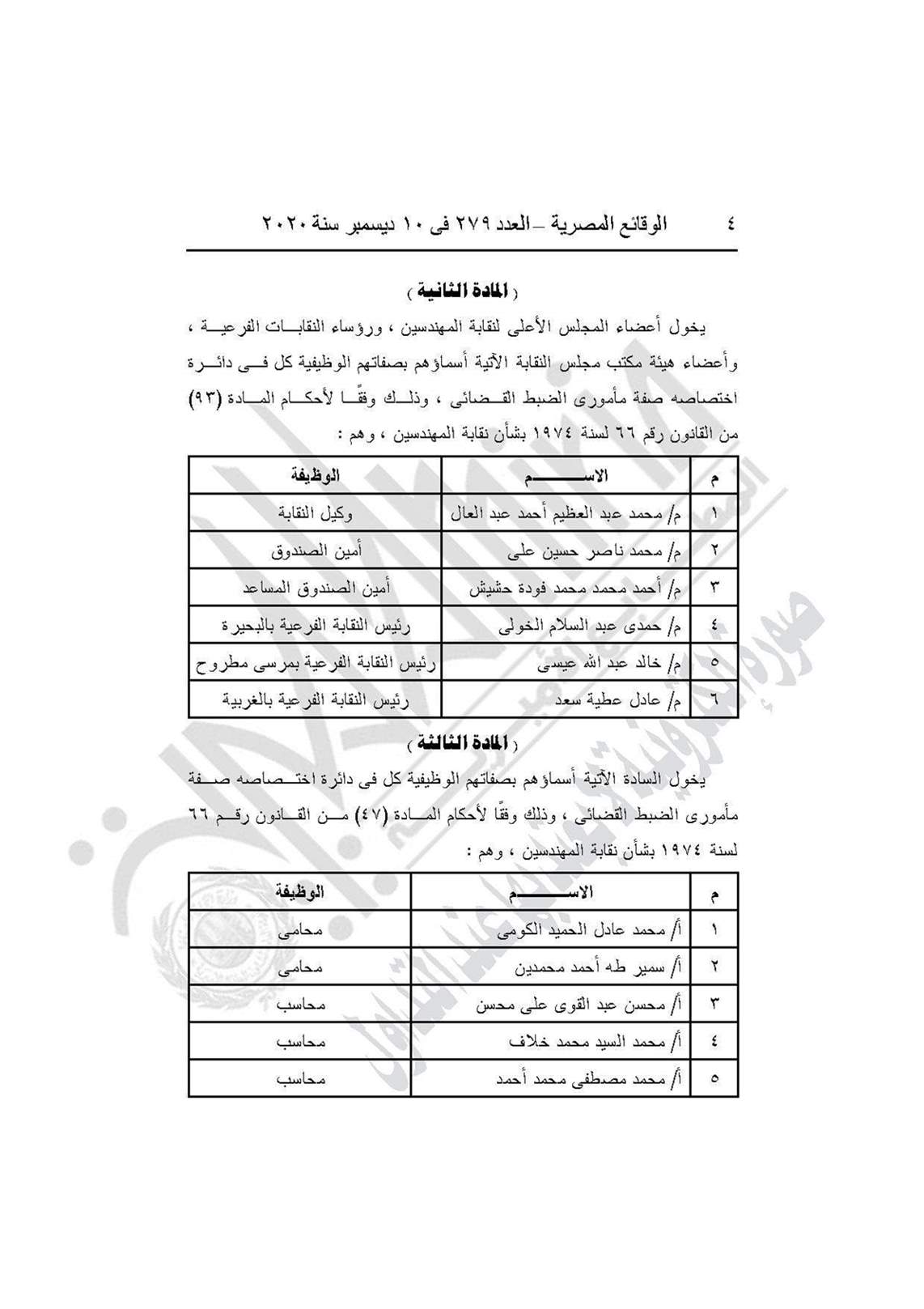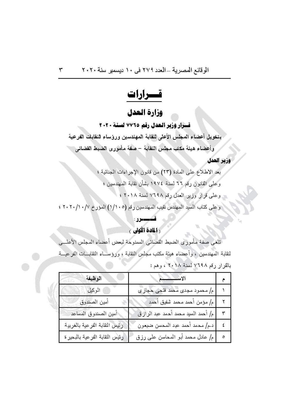 القرار رقم 7765 لسنة 2020، بتخويل أعضاء المجلس الأعلى لنقابة المهندسين ورؤساء النقابات الفرعية وأعضاء هيئة مكتب مجلس النقابة صفة مأموري الضبط القضائي.