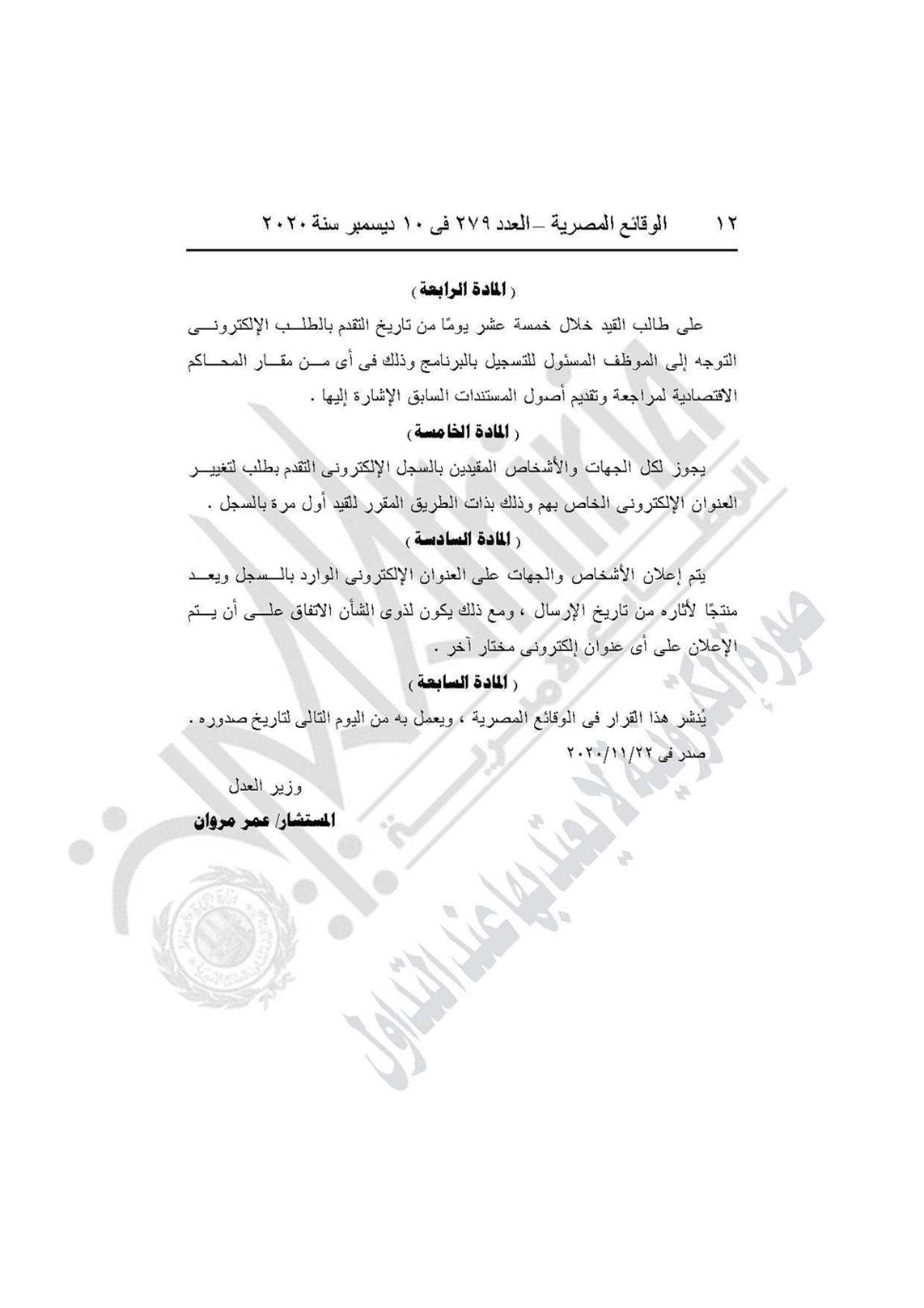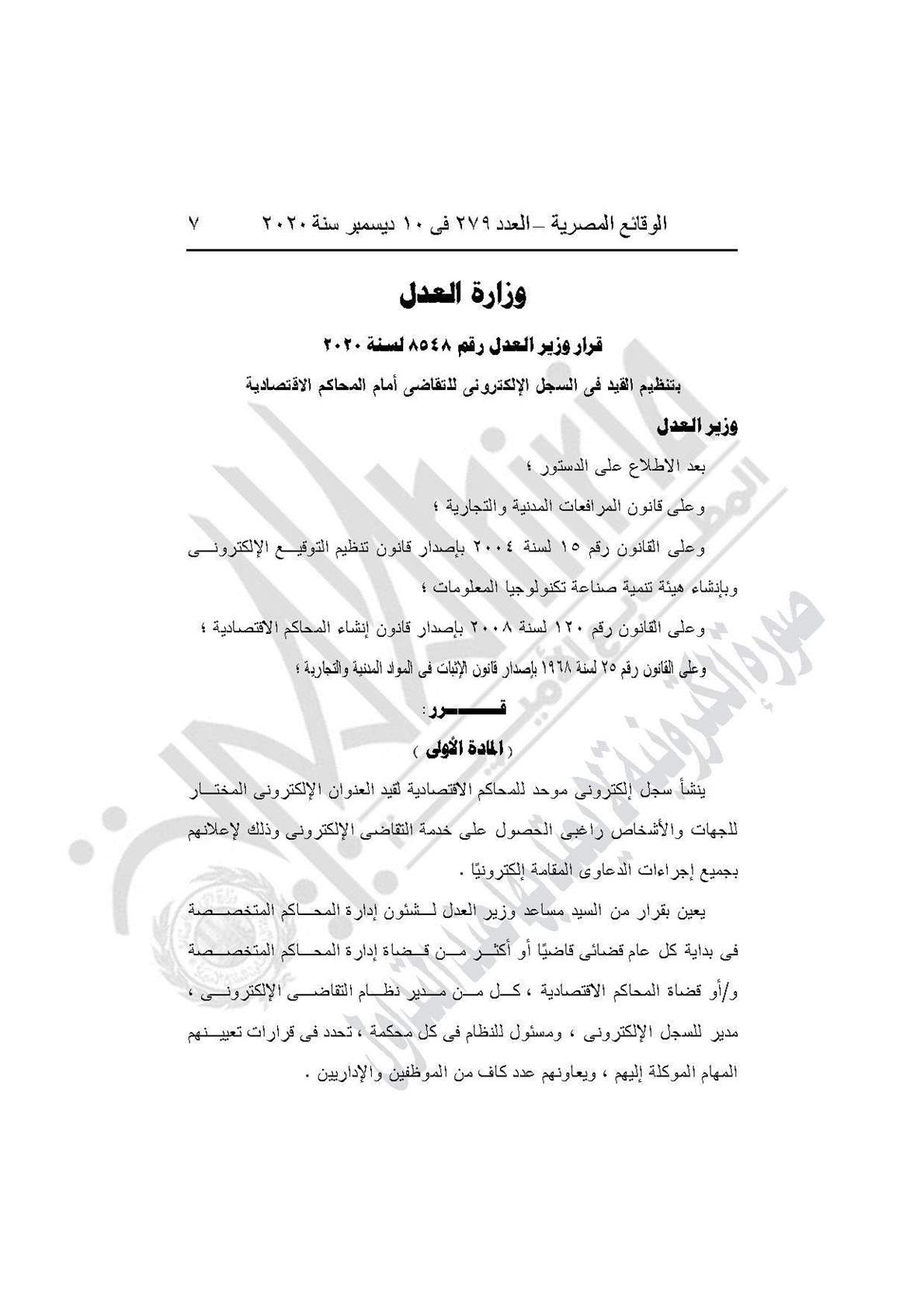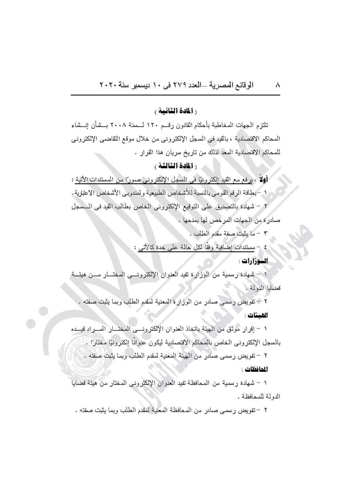والقرار رقم 8548 لسنة 2020، بتنظيم القيد في السجل الإلكتروني للتقاضي أمام المحاكم الاقتصادية.