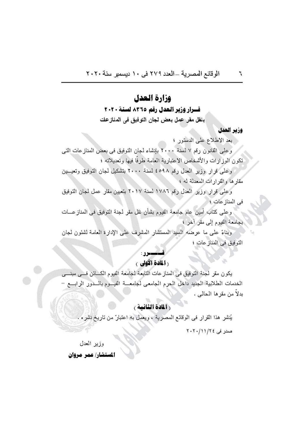 والقرار رقم 8365 لسنة 2020، بنقل مقر عمل بعض لجان التوفيق في المنازعات.