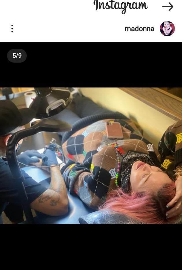 ظهرت مادونا خلال الصور مستلقية بينما كانت فنانة الوشم تعمل على معصمها، رفعت أيقونة الموسيقى يدها في شعرها الوردي، ويفترض أنها تعاني من الألم.