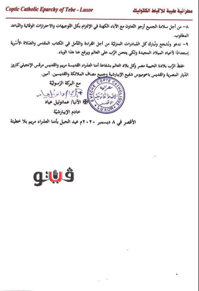 أعلنت إيبارشية طيبة للأقباط الكاثوليك الإجراءات الاحترازية لمواجهة الموجة الثانية لفيروس كورونا المستجد، بعد التشاور مع الإكليروس الإيبارشي، عن 9 إجراءات في إطار الاحتفالات بعيد "الحبل بلا دنس والعذراء مريم بلا خطيئة".