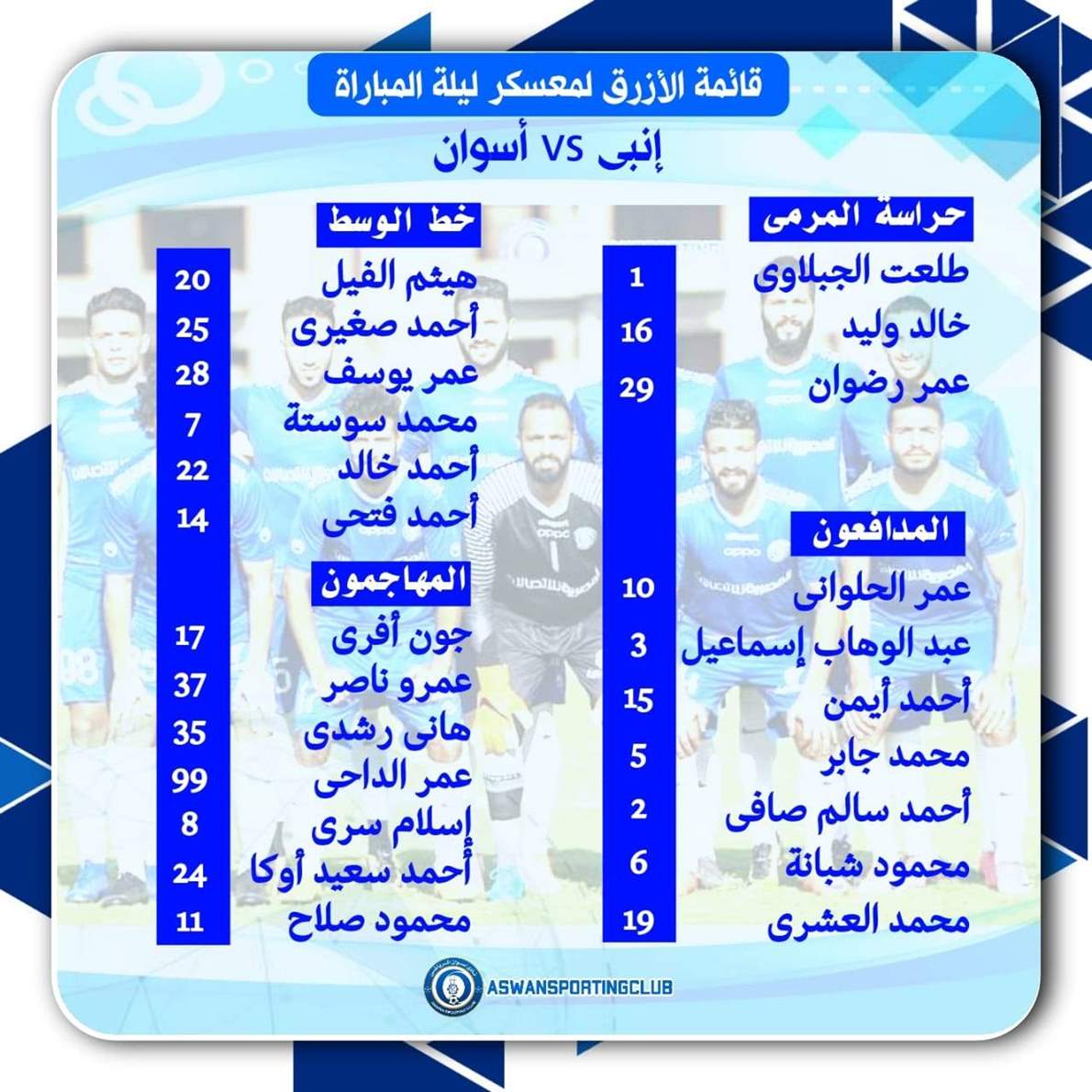 أعلن سامي الشيشيني، المدير الفني لفريق أسوان، قائمة لاعبيه استعدادًا لمواجهة إنبي في افتتاح بطولة الدوري الممتاز في اللقاء المقرر له اليوم الجمعة بإستاد بتروسبورت بالتجمع الخامس في تمام الساعة الثانية والنصف ظهرًا.