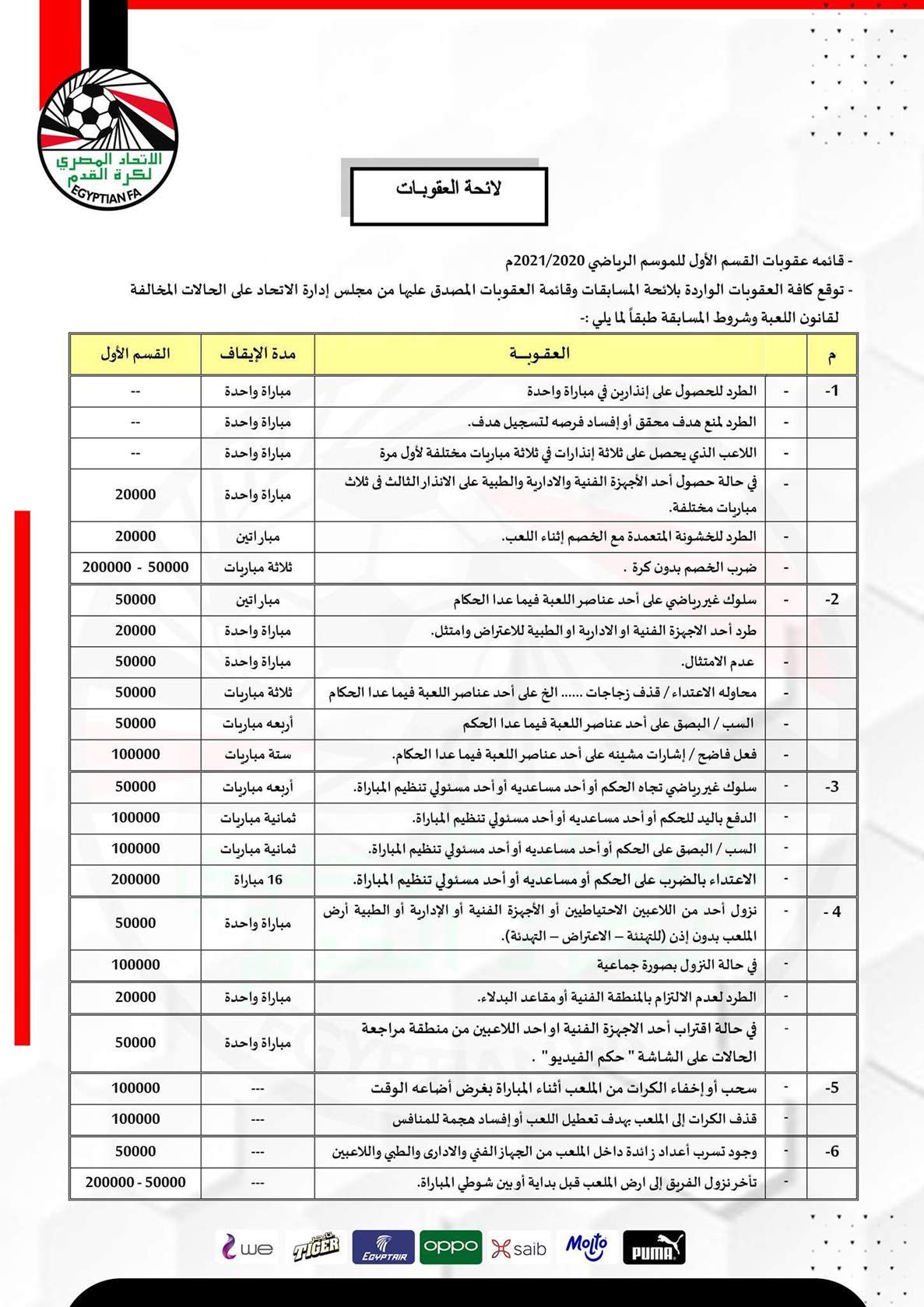 أعلن اتحاد الكرة عن لائحة العقوبات الخاصة للدوري الممتاز بالموسم الجديد 2020-2021، قبل انطلاق النسخة 62 للدوري اليوم الجمعة بثلاث مواجهات بين "إنبي وأسوان، وطلائع الجيش مع الجونة، والإنتاج الحربي مع سيراميكا كليوباترا".