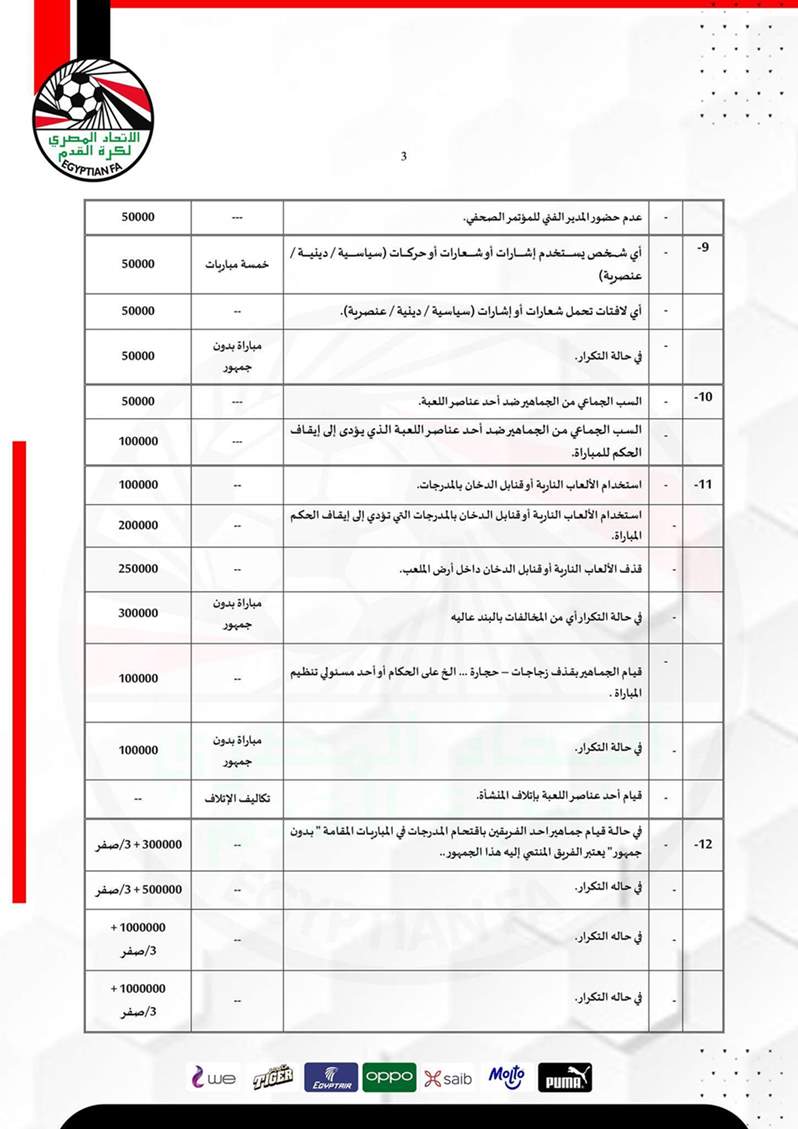 وفي حال استخدم أي شخص لإشارات أو حركات سياسية أو دينية أو عنصرية، سيتعرض للإيقاف 5 مباريات بجانب غرامة 50 ألف جنيه.