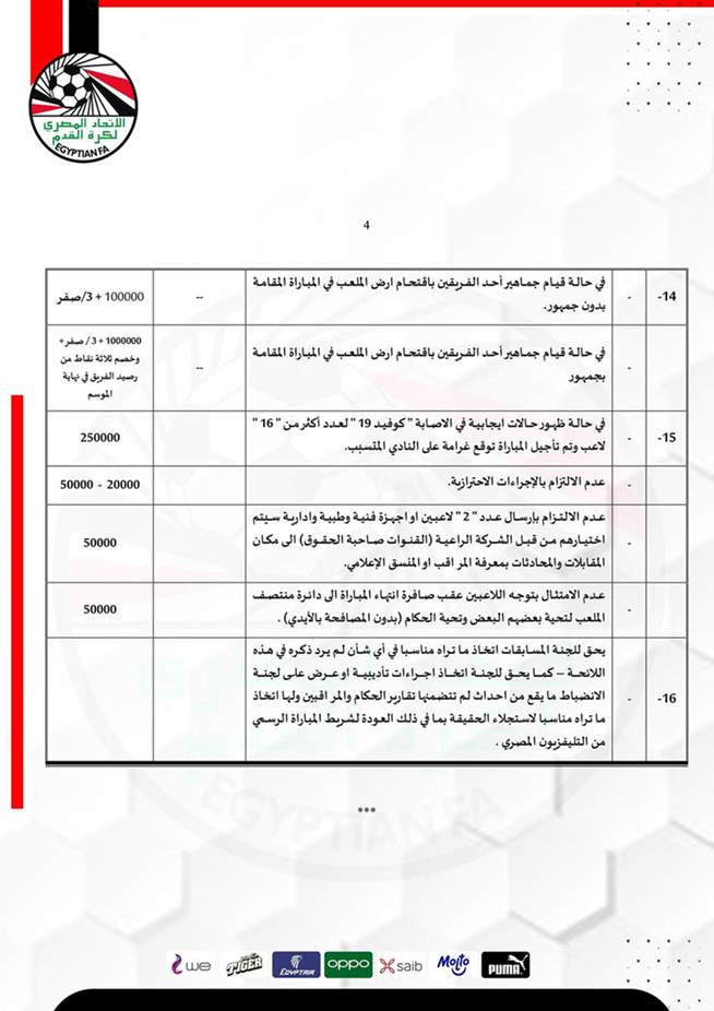 البند رقم 15 في لائحة العقوبات أنه في حالة ظهور حالات إيجابية للإصابة بفيروس كورونا كوفيد 19، لعدد أكثر من 16 لاعبًا في فريق واحد يتم تأجيل المباراة وتوقع غرامة على النادي المتسبب وقدرها 250 ألف جنيه.