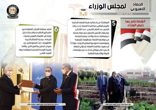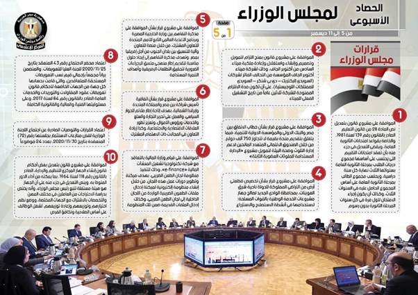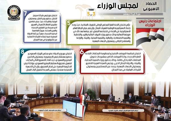 نشر المركز الإعلامي لمجلس الوزراء، تقريراً شمل إنفوجرافات سلط من خلالها الضوء على الحصاد الأسبوعي لمجلس الوزراء، وذلك خلال الفترة من 5 ديسمبر إلى 11 ديسمبر 2020، والذي تضمن الموافقة على عدد من القرارات، فضلاً عن الاجتماعات التي عقدها الدكتور مصطفى مدبولي، رئيس مجلس الوزراء، بالإضافة إلى ما قام به من أنشطة.