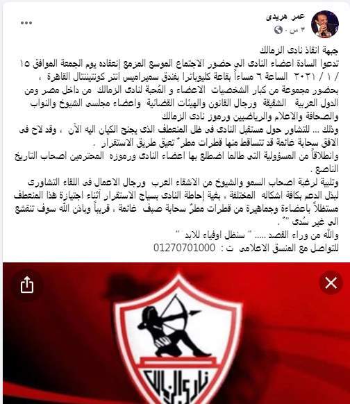 تدعو أعضاء النادي إلى حضور الاجتماع الموسع المزمع انعقاده يوم الجمعة الموافق ١٥ / ١ / ٢٠٢١ الساعة ٦ مساء بقاعة كليوباترا بفندق سميراميس إنتر كونتيننتال القاهرة، بحضور مجموعة من كبار الشخصيات الأعضاء والمُحبة لنادي الزمالك من داخل مصر ومن الدول العربية الشقيقة ورجال القانون والهيئات القضائية وأعضاء مجلسي الشيوخ والنواب والصحافة والإعلام والرياضيين ورموز نادي الزمالك