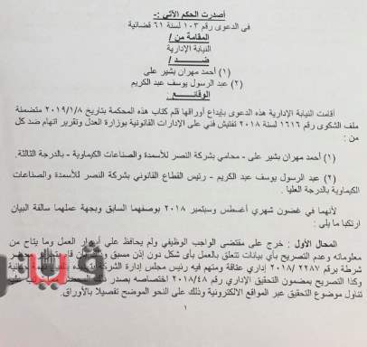 براءة رئيس القطاع القانوني ومجازاة محام بـ"النصر للأسمدة والصناعات الكيماوية"