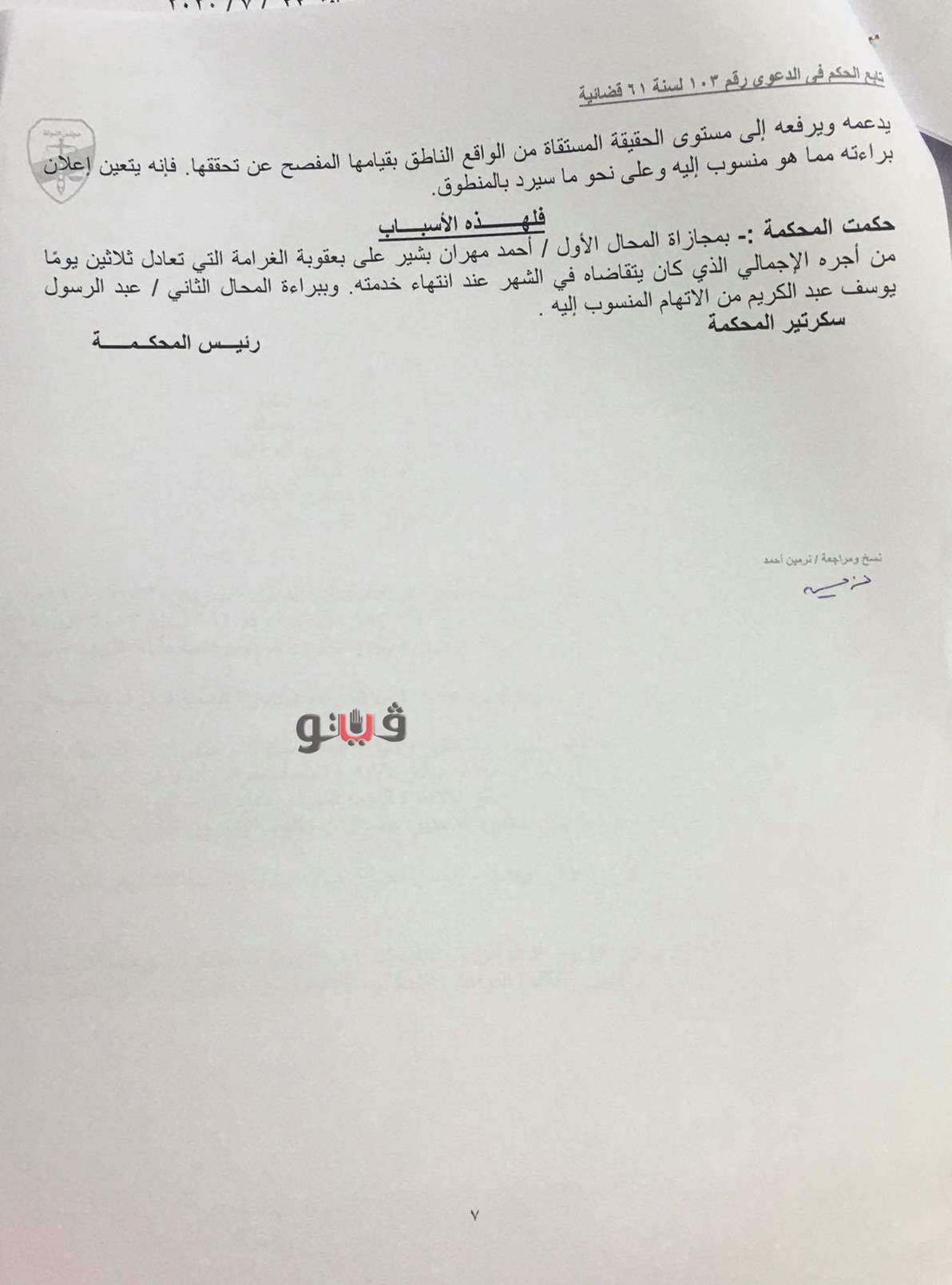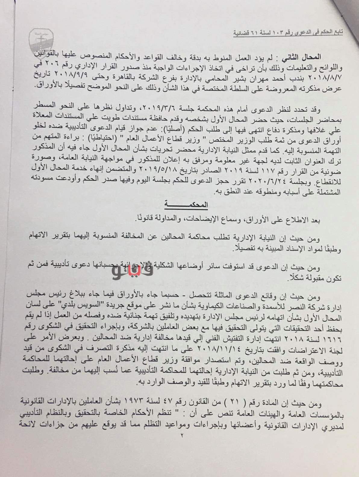 وتضمن الحكم أن أحمد مهران بشير، المحامي بالشركة قام بتحرير محضر شرطة برقم 2287 لسنة 2018 يتهم فيه رئيس مجلس إدارة الشركة بتهديده بتلفيق تهمة جنائية ضده، والتصريح بمضمون التحقيق الإداري رقم 48 لسنة 2018 اختصاصه بصدر ذلك المحضر مما ترتب عليه تناول موضوع التحقيق عبر المواقع الإلكترونية، فأصدرت المحكمة حكمها بمجازاته بعقوبة الغرامة التي تعادل أجر 30 يومًا من راتبه الإجمالي الذي كان يتقاضاه في الشهر عند انتهاء خدمته.