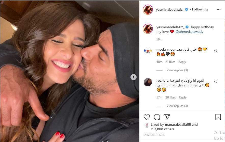 ونشرت ياسمين عبد العزيز مجموعة من الصور الرومانسية مع "العوضي"، معلقة عليها: "عيد ميلاد سعيد حبيبي".