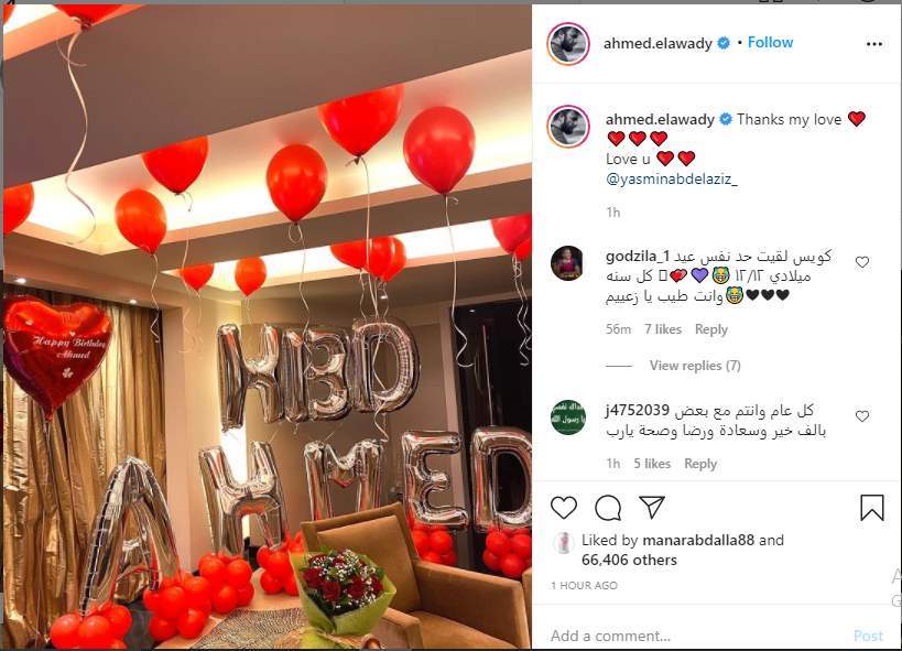 وشارك الفنان أحمد العوضي، جمهوره ومتابعيه عبر حسابه الشخصي على موقع التواصل الاجتماعي "إنستجرام" صورة من احتفال زوجته بعيد ميلاده، معلقًا: "شكرًا حبيبتي.. بحبك".