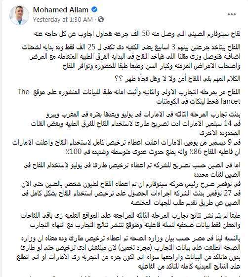 وكتب محمد علام تدوينة على الفيس بوك "لقاح سينوفارم الصينى اللى وصل منه 50 ألف جرعة هحاول أجاوب عن كل حاجة عنه".