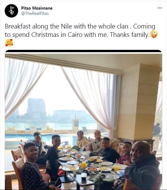 وكتب موسيماني تغريدة على تويتر: "الإفطار على طول نهر النيل مع كل العشيرة.. قدموا لقضاء عيد الميلاد في القاهرة معي. شكرا للعائلة"
