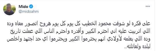 وكتب أحمد حسام ميدو تغريدة على تويتر قال فيها: "على فكره لو شوفت محمود الخطيب كل يوم هروح اتصور معاه وده اللي اتربيت عليه اني احترم الكبير وأقدره واحترم الناس اللي عملت تاريخ وده اللي بعلمه لأولادي انهم يحترموا الكبير ويحترموا اي حد اجتهد واخلص لبلده ولعائلته.."