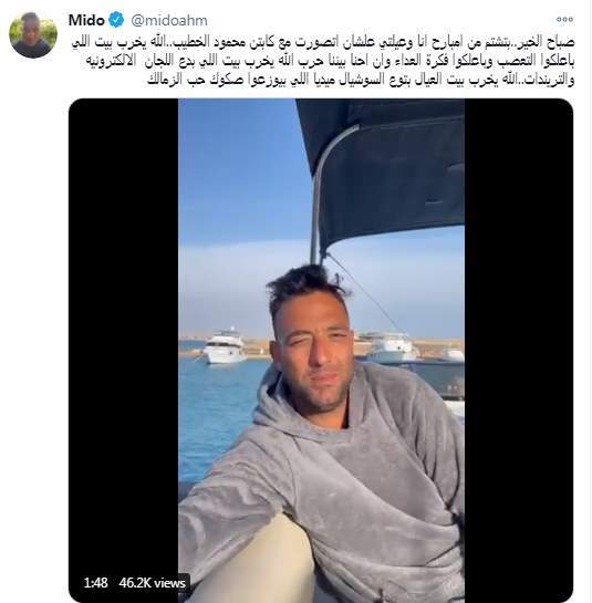 وكان ميدو بث فيديو تعليقًا على ما تعرض له وعائلته بسبب التقاط صورة له وعائلته مع محمود الخطيب رئيس مجلس إدارة النادي الأهلي فقال " صباح الخير..بتشتم من امبارح انا وعيلتي علشان اتصورت مع كابتن محمود الخطيب..الله يخرب بيت اللي باعلكوا التعصب وباعلكوا فكرة العداء وان احنا بيننا حرب الله يخرب بيت اللي بدع اللجان الالكترونيه والتريندات..الله يخرب بيت العيال بتوع السوشيال ميديا اللي بيوزعوا صكوك حب الزمالك"
