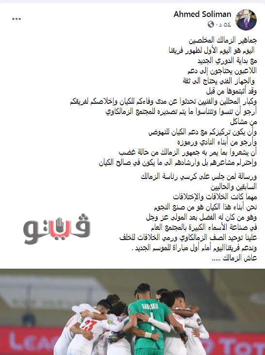 وكتب سليمان عبر حسابه: " جماهير الزمالك المخلصين، اليوم هو اليوم الأول لظهور فريقنا ، مع بداية الدوري الجديد اللاعبون يحتاجون إلى دعم والجهاز الفني يحتاج الى ثقة، وقد أثبتموها من قبل".