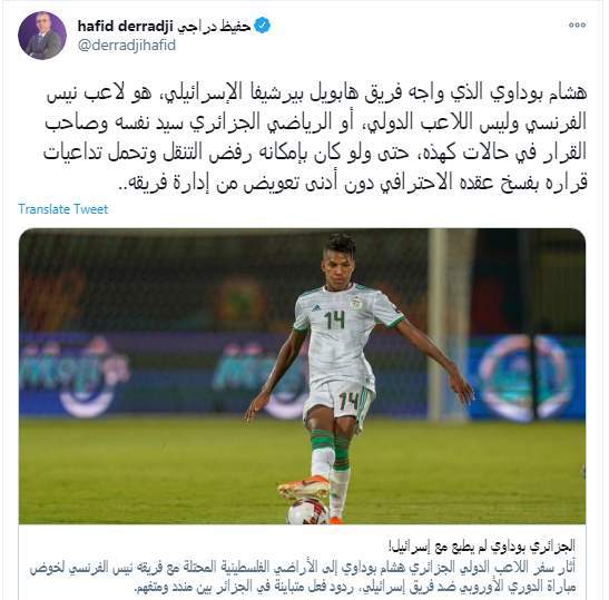 وكتب حفيظ دراجي تغريدة على تويتر: "هشام بوداوي الذي واجه فريق هابويل بيرشيفا الإسرائيلي، هو لاعب نيس الفرنسي وليس لاعبا دوليًا.
