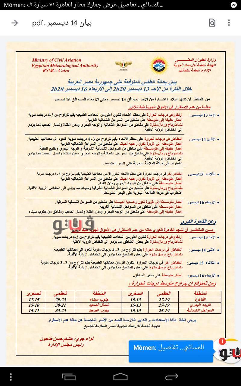 - انخفاض فى درجات الحرارة ونشاط رياح ورمال مثارة على بعض مناطق القاهرة الكبرى والوجه البحرى والسواحل الشمالية ومدن القناة وشمال الصعيد وأمطار خفيفة على السواحل الغربية.