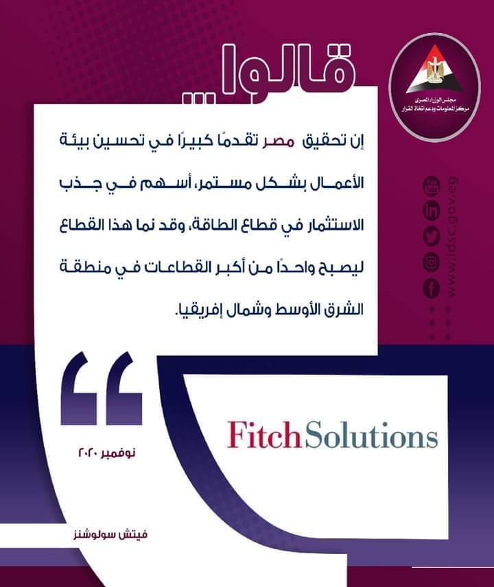 صنفت وكالة فيتش سولوشنز مصر ضمن أفضل الدول في قطاع الطاقة في منطقة الشرق الأوسط وشمال إفريقيا.
