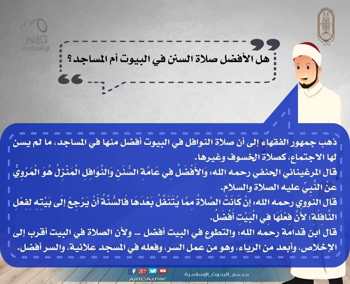 ورد سؤال إلى لجنة الفتوى بمجمع البحوث الإسلامية بالأزهر الشريف يقول فيه صاحب"هل الأفضل صلاة السنن في البيوت أم المساجد؟"، وجاء رد اللجنة كالتالي: