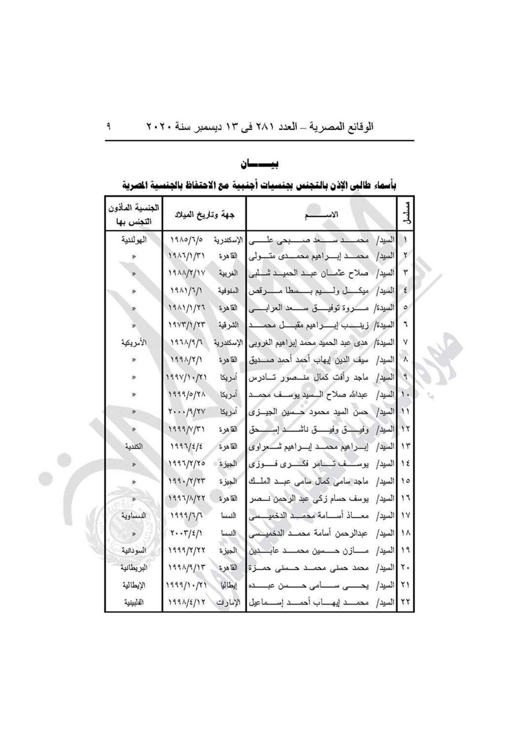 نشرت جريدة الوقائع المصرية في عددها رقم 281، الصادر في 13 ديسمبر 2020، قرار وزارة الداخلية بالإذن لـ44 مواطنًا بالتجنس بالجنسية الأجنبية مع احتفاظهم بالجنسية المصرية.