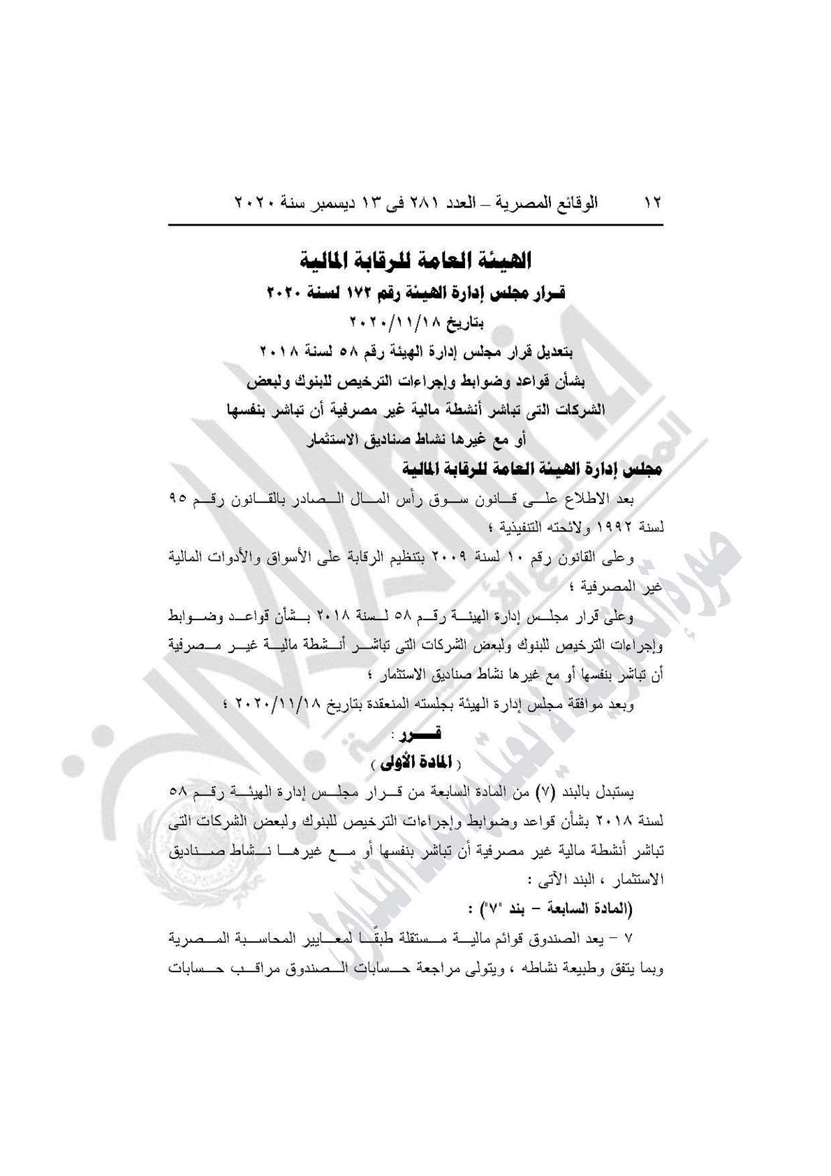 القرار رقم 172 لسنة 2020، بتعديل قرار مجلس إدارة الهيئة رقم 58 لسنة 2018، بشأن قواعد وضوابط وإجراءات الترخيص للبنوك ولبعض الشركات التي تباشر أنشطة مالية غير مصرفية أن تباشر بنفسها أو مع غيرها نشاط صناديق الاستثمار.