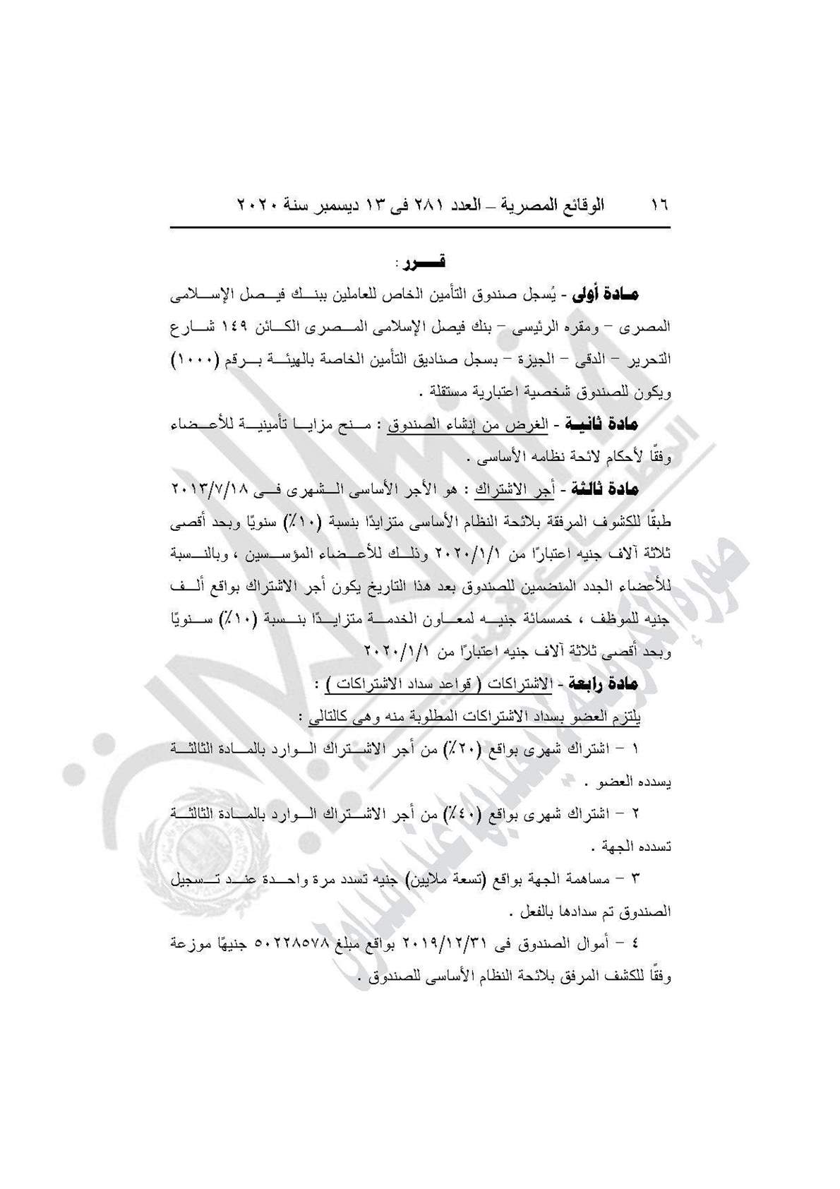 والقرار رقم 1288 لسنة 2020، بتسجيل صندوق التأمين الخاص للعاملين ببنك فيصل الإسلامي المصري.