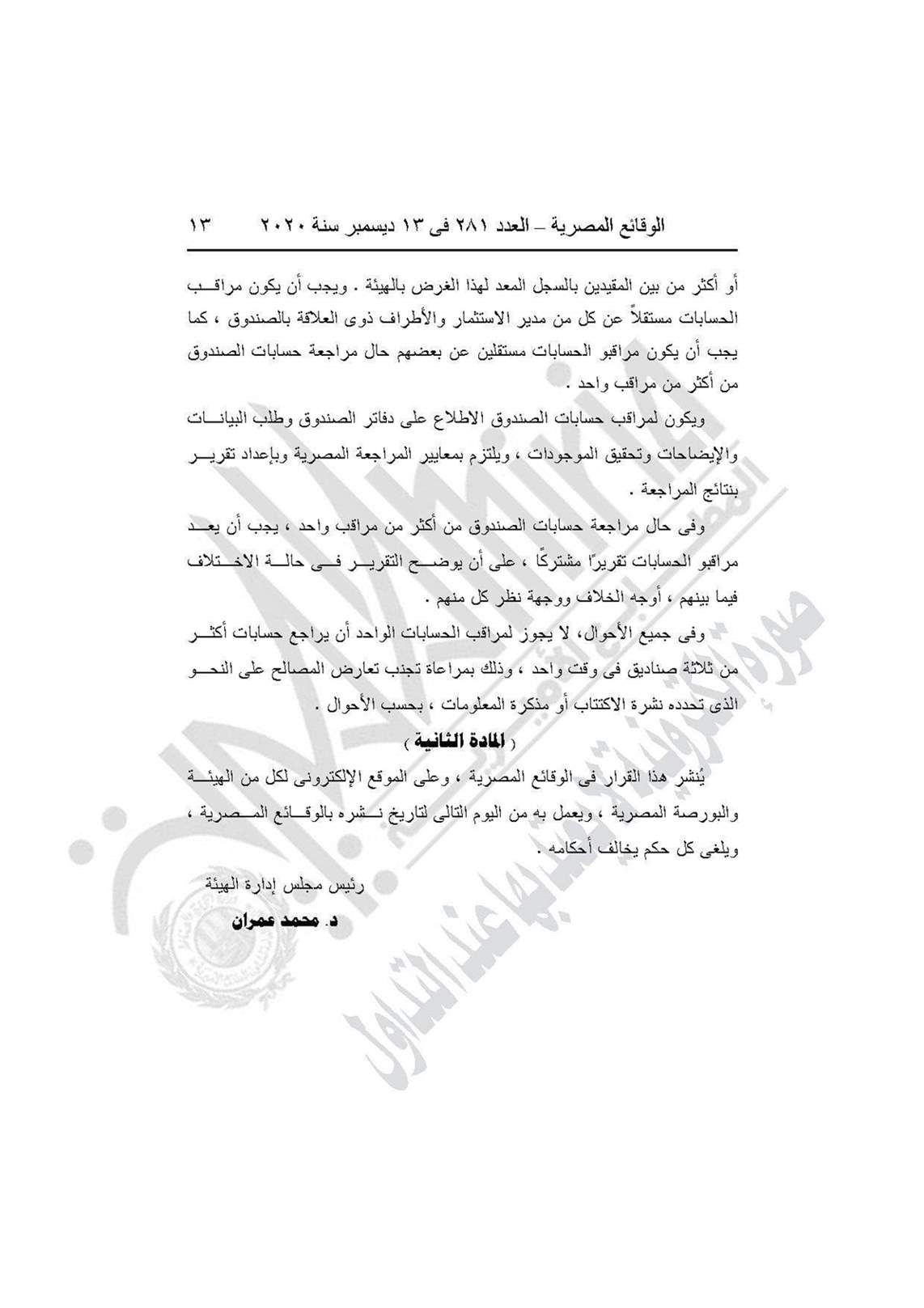 نشرت جريدة الوقائع المصرية في عددها رقم 281، الصادر في 13 ديسمبر 2020، 3 قرارات للهيئة العامة للرقابة المالية بتعديل إجراءات الترخيص للبنوك ولبعض الشركات، تحديد القائمة الأولية لمراقبي البيئة الدوليين، بتسجيل صندوق التأمين الخاص للعاملين ببنك فيصل.