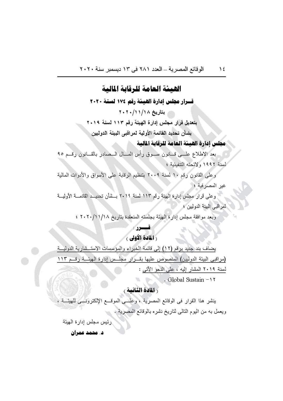 والقرار رقم 174 لسنة 2020، بتعديل قرار مجلس إدارة الهيئة رقم 113 لسنة 2019، بشأن تعديل تحديد القائمة الأولية لمراقبي البيئة الدوليين.