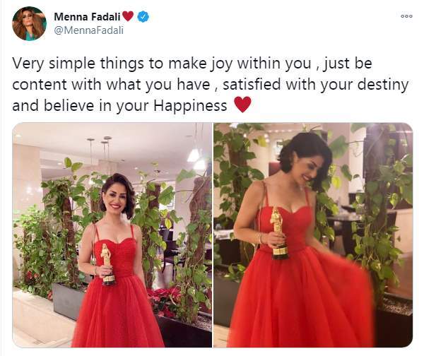 وكتبت منة فضالي تغريدة على تويتر "أشياء بسيطة جدًا تجعلك تشعر بالبهجة، فقط كن قانعًا بما لديك، راضيًا عن قدرك وآمن بسعادتك".