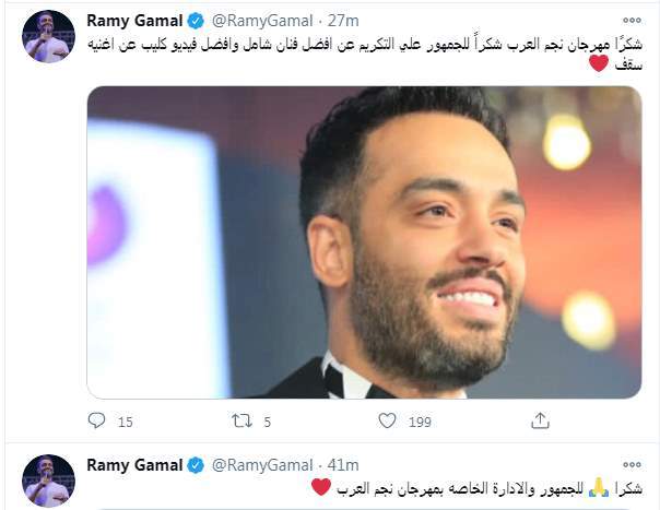 وكتب رامي جمال تغريدة على تويتر "شكرا للجمهور والإدارة الخاصة بمهرجان نجم العرب".