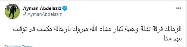 وكتب أيمن عبد العزيز تغريدة على تويتر: "الزمالك فرقة تقيلة ولعيبة كبار مشاء الله مبروك يارجالة مكسب فى توقيت مهم جدا"