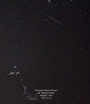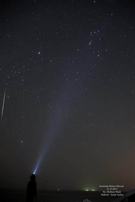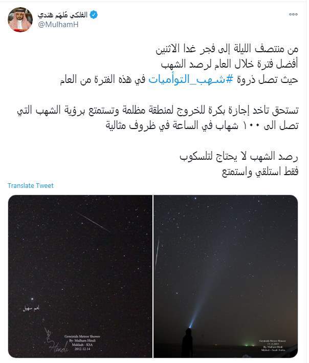 وكتب مُلهم هندي تغريدة على تويتر "من منتصف الليلة إلى فجر غدا الاثنين أفضل فترة خلال العام لرصد الشهب حيث تصل ذروة #شهب_التوأميات في هذه الفترة من العام"