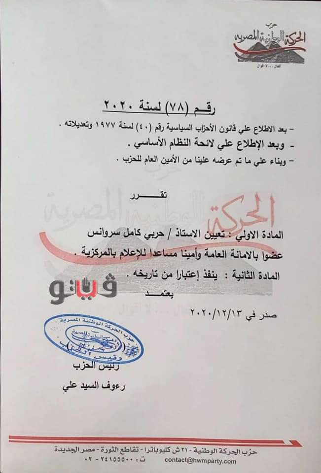 وتقرر من خلال القرار الصادر رقم (78) لسنة 2020، تعيين حربي كامل سروانس، عضوا بالامانة العامة وأمينا مساعدا للإعلام بالمركزية، على أن ينفذ اعتبارا من تاريخه.