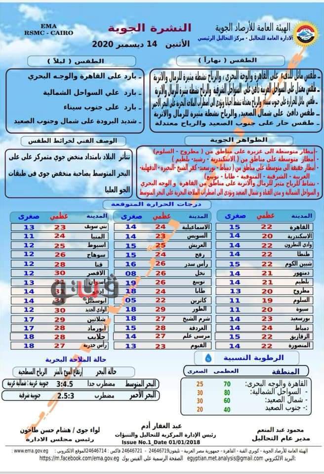 ومن المتوقع انخفاض فى درجات الحرارة ونشاط رياح ورمال مثارة على بغض مناطق القاهرة الكبرى والوجه البحرى والسواحل الشمالية ومدن القناة وشمال الصعيد وأمطار خفيفة على السواحل الغربية